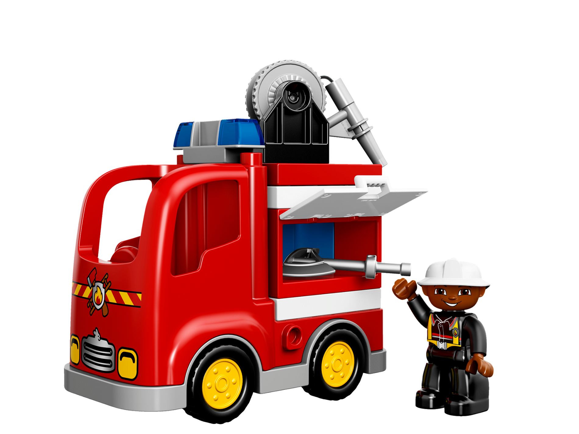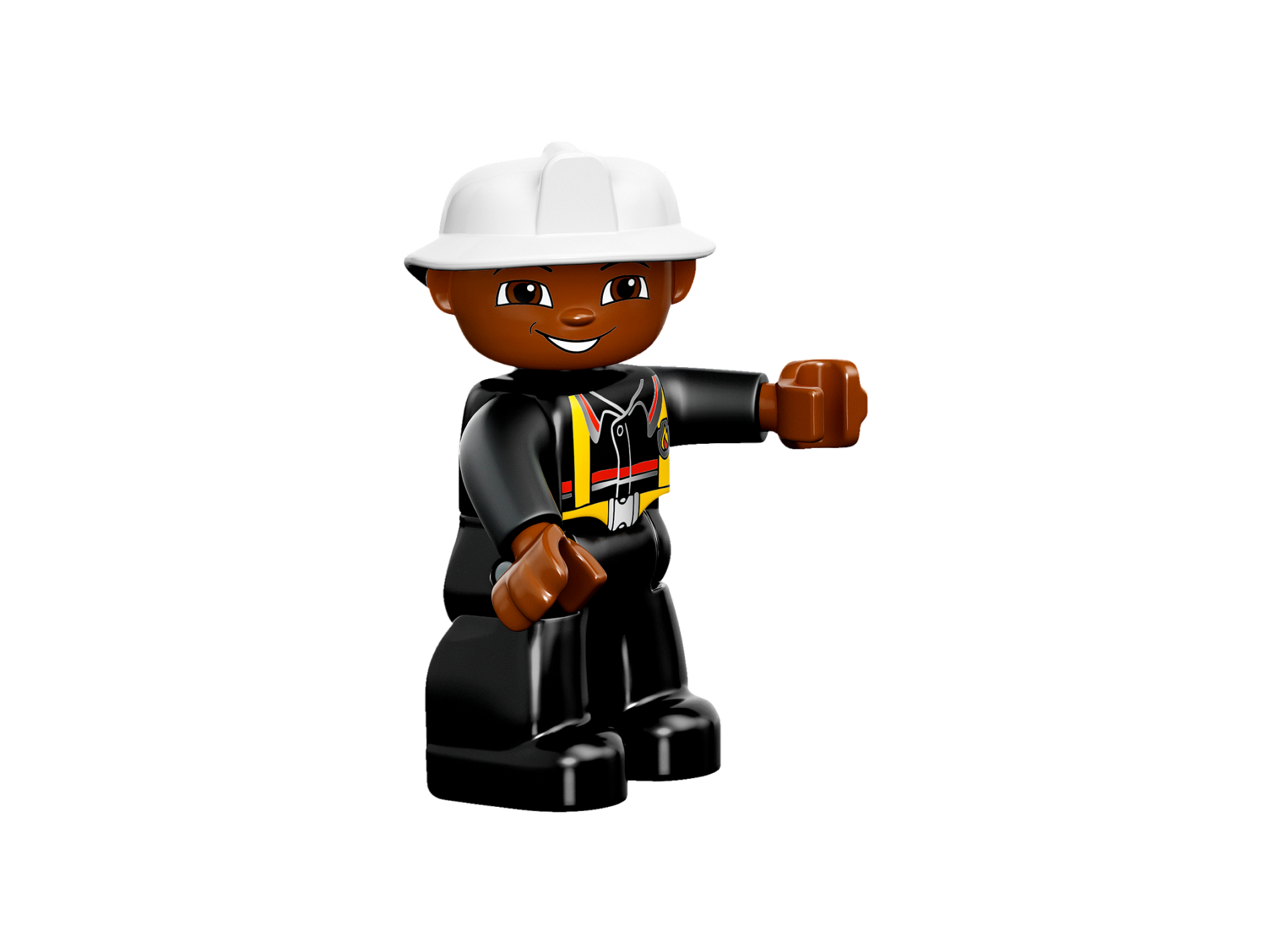 Duplo Figure Lego Ville, Male Fireman, Black Legs, Brown Hands, White Helmet, Brown Face
