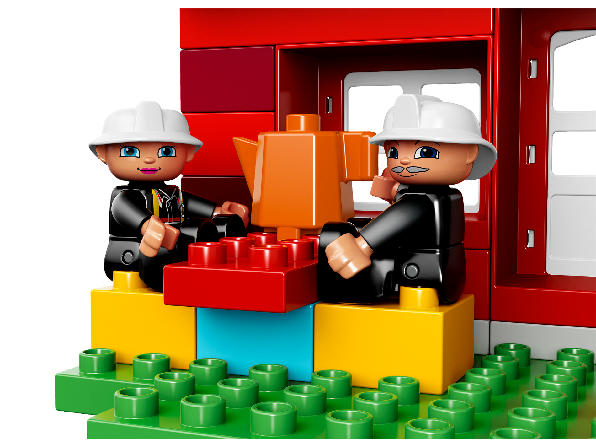 Duplo Figure Lego Ville, Male Fireman, Black Legs, Nougat Hands, White Helmet, Light Gray Moustache