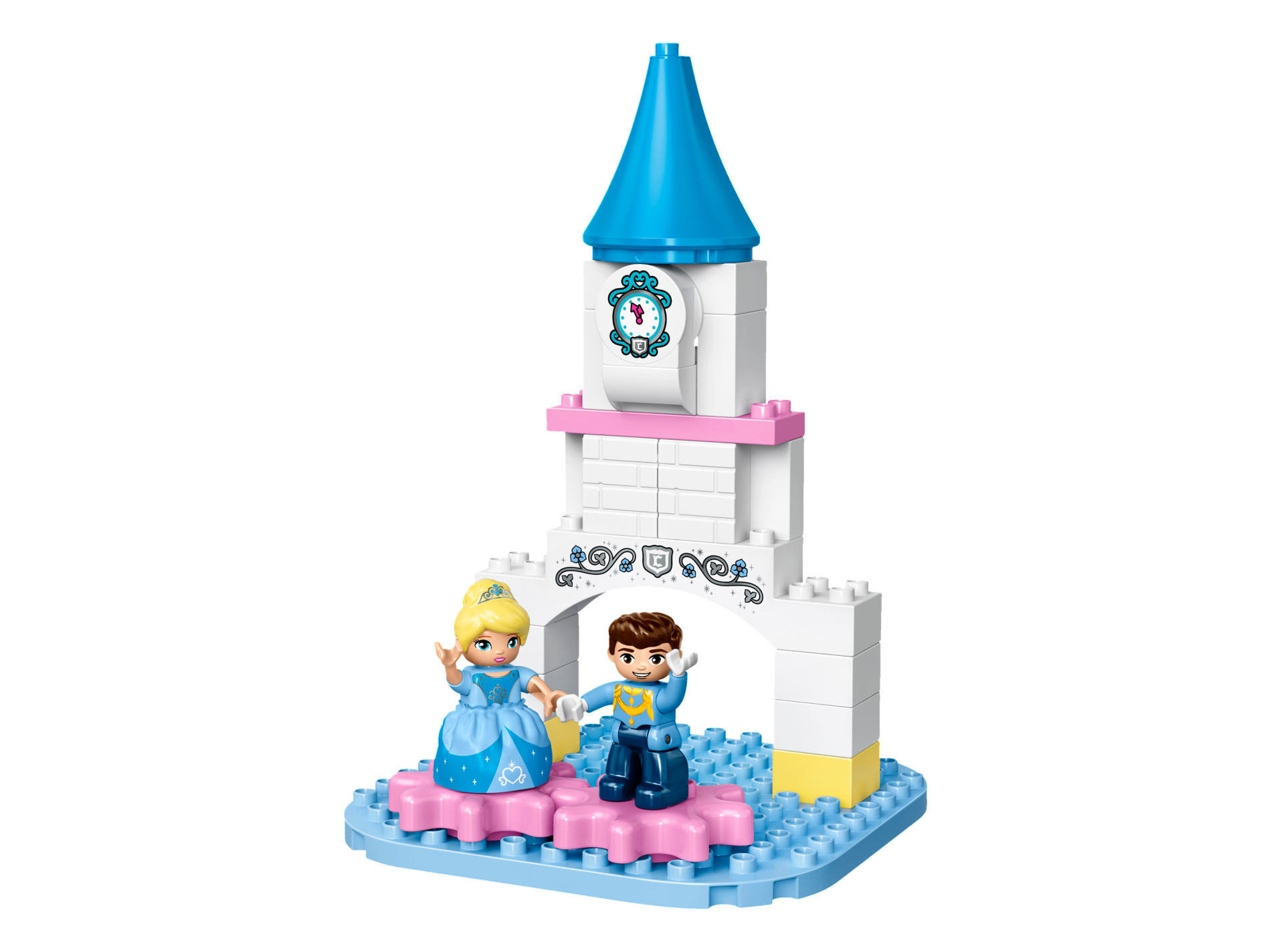 Duplo, Brick 1 x 3 x 2 Round Top, Cut Away Sides with Dark Azure and Silver Clock Face, Dark Pink Clock Hands, and 'C' in Shield Pattern
