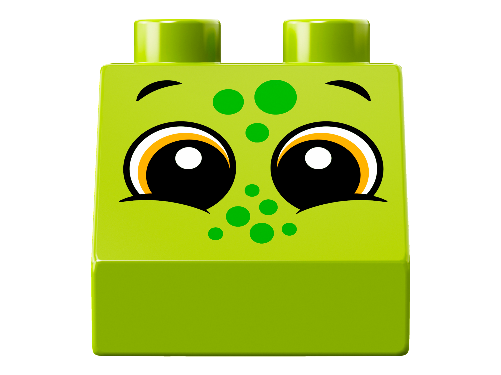 Duplo, Brick 2 x 2 Slope 45 with 2 Eyes and Green Spots Pattern (Lizard)