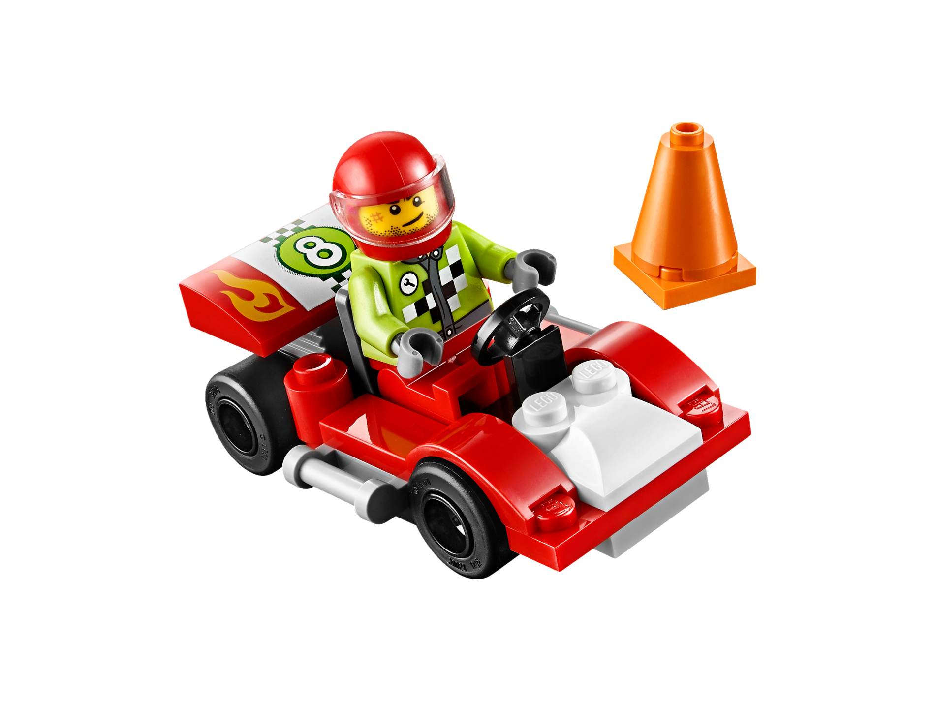 Slope, Curved 2 x 4 x 2/3 No Studs with Bottom Tubes with Flames and Number 8 in Lime Circle over Checkered Flag Pattern