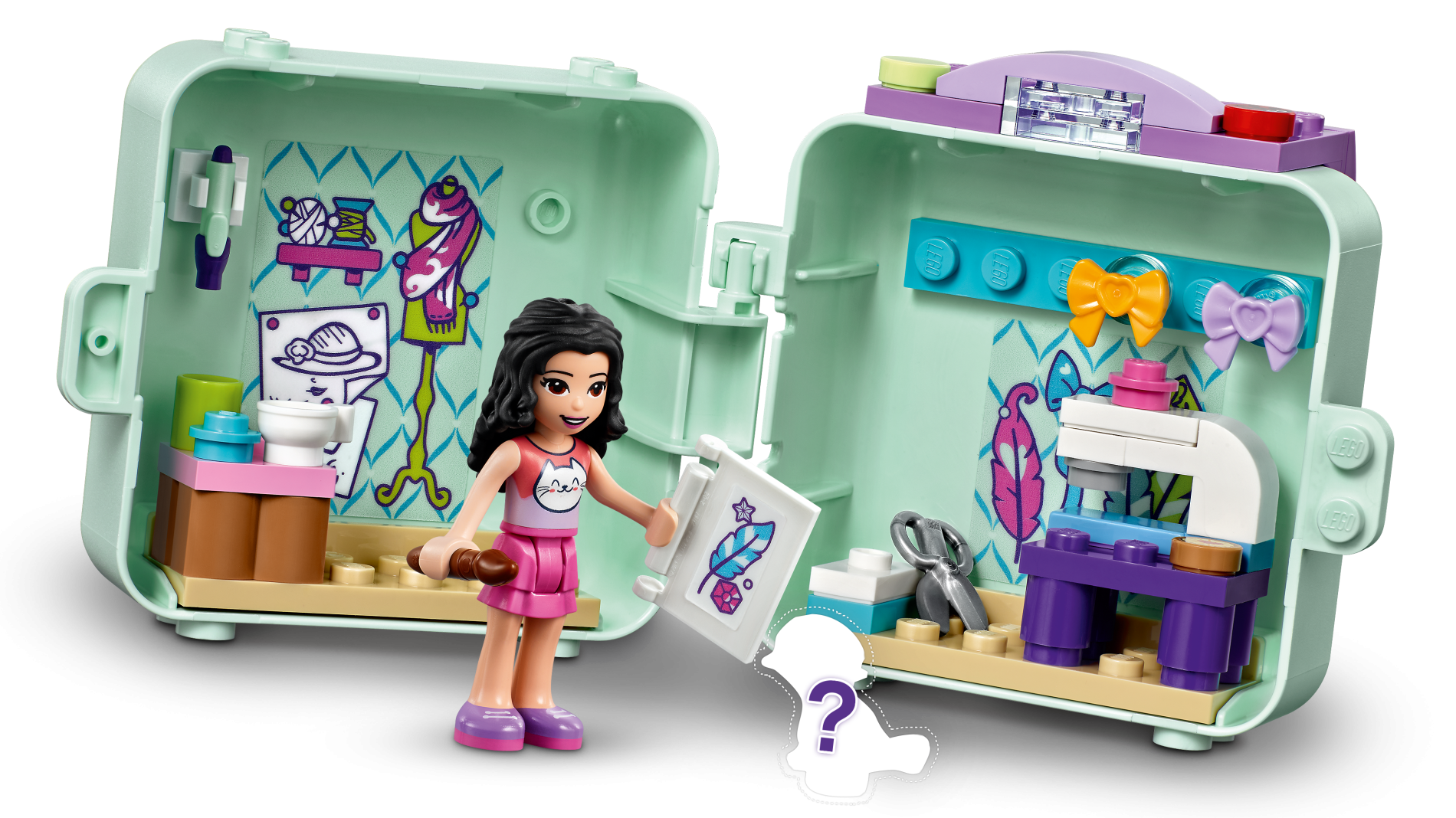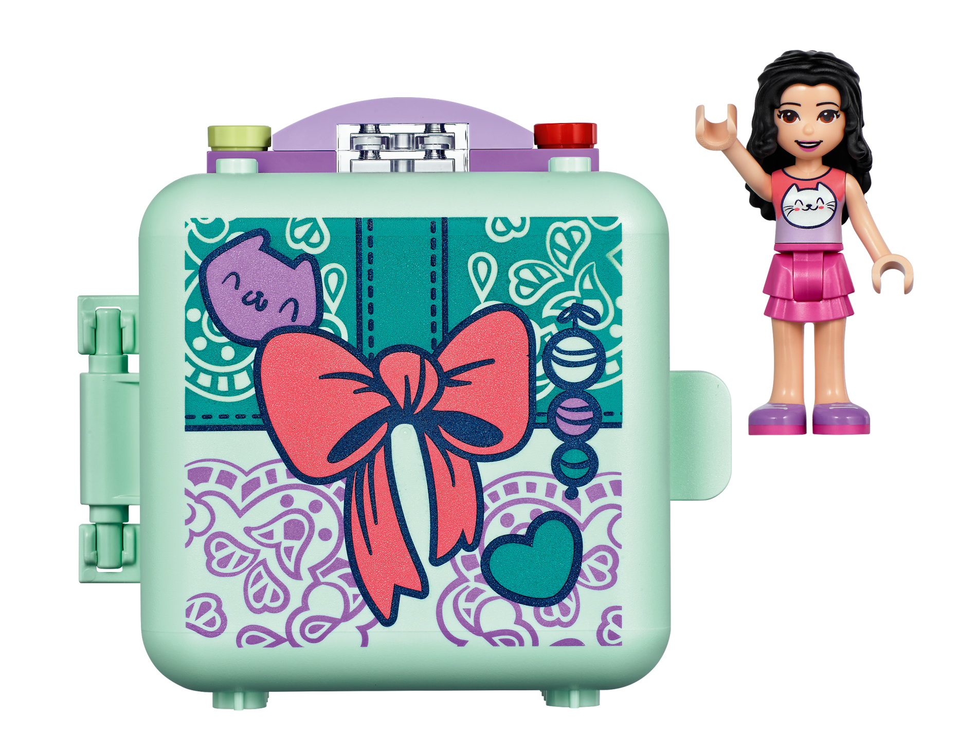 Container, Box 3 x 8 x 6 2/3 Half Front with Present with Coral Bow, Medium Lavender Cat Face, Dark Turquoise Heart, and Ornament Pattern