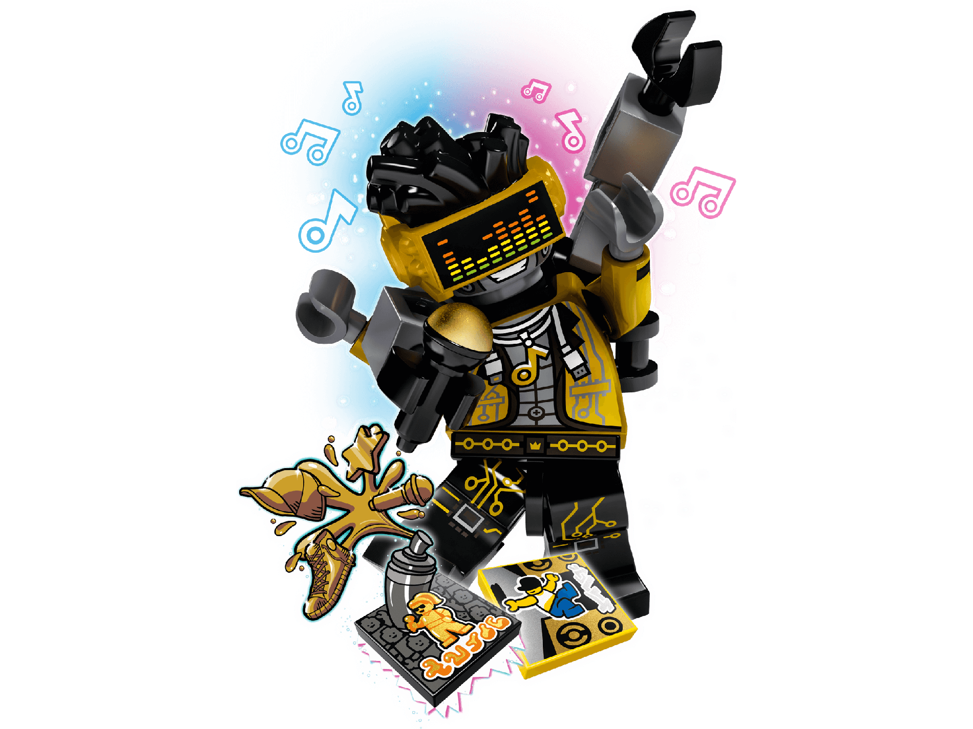 | 1 X Tile 2 x 2 with Groove with BeatBit Album Cover - Gold Singer with Minifigure Audience Pattern | Black |   |  |