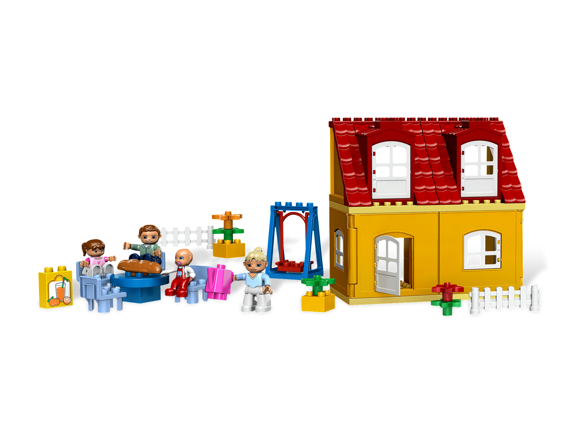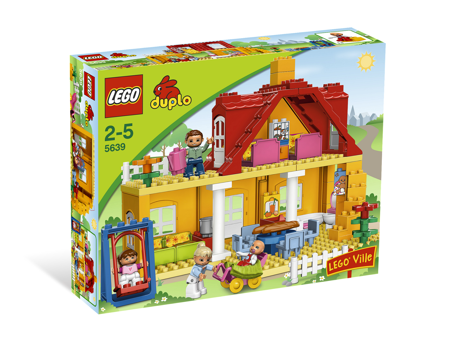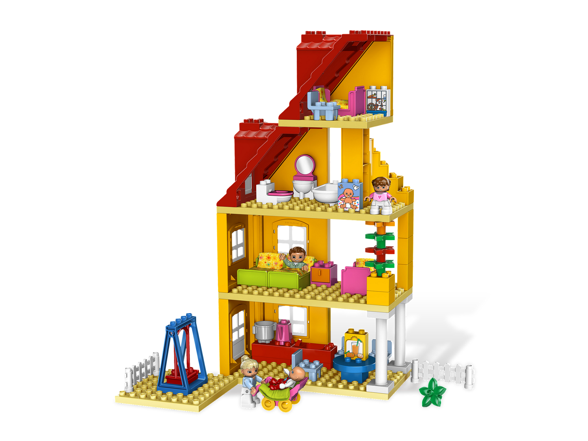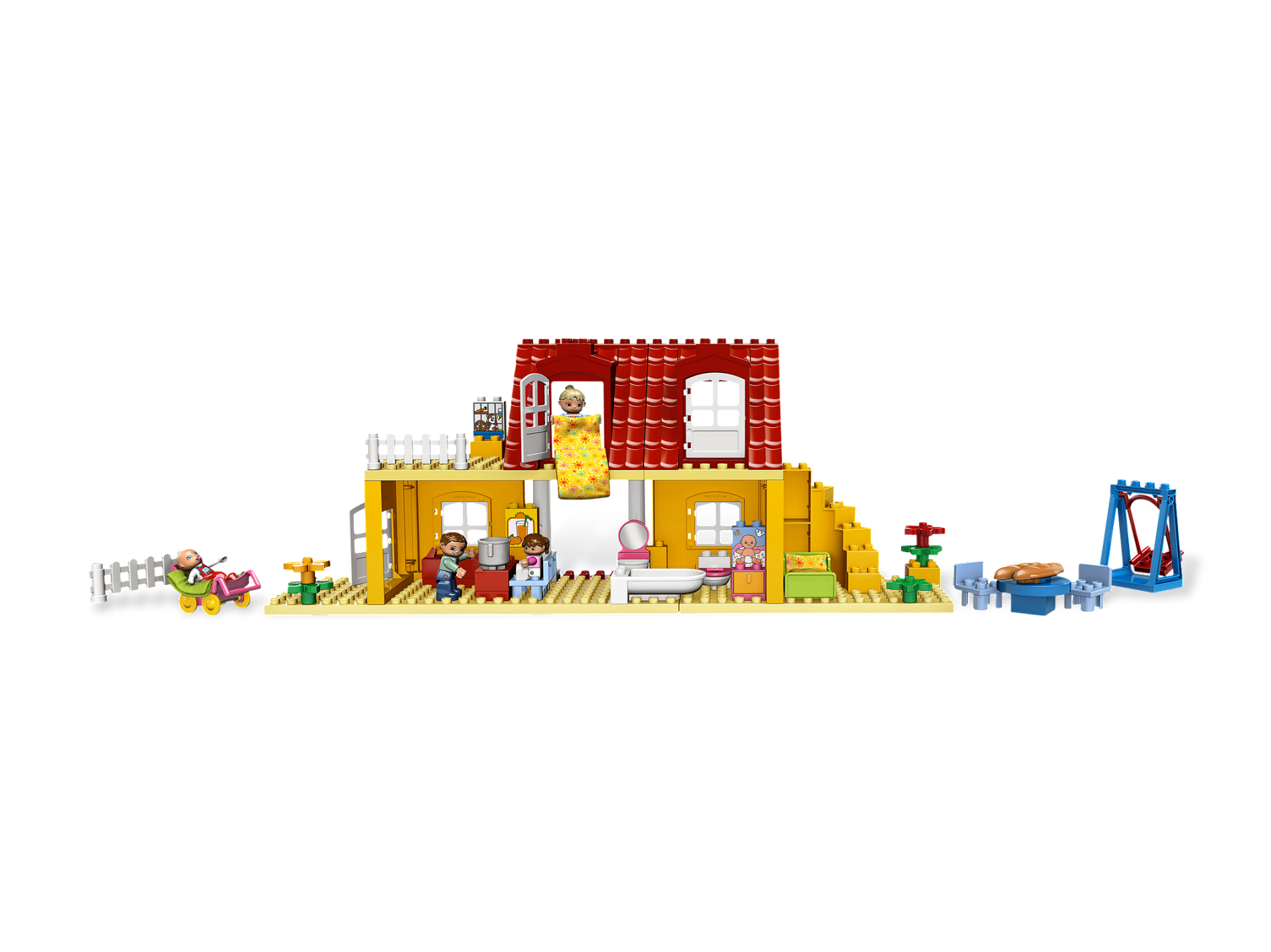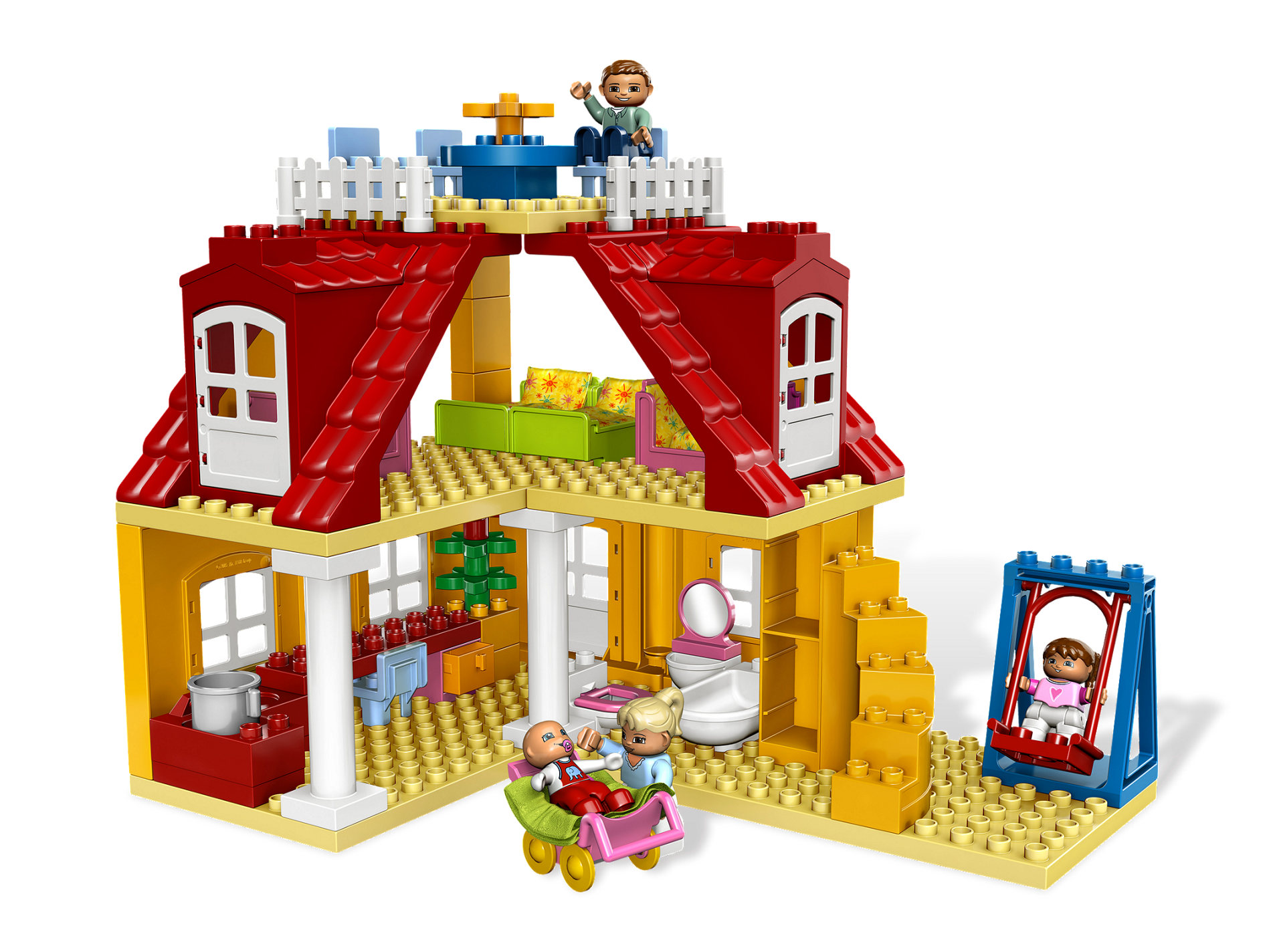 Take the baby for a walk in the stroller, go for a ride on the swing, take a nap in a sleeping bag or enjoy a fun family meal. There's all that and more in the Family House! A great family house in uni-sex colors! Includes DUPLO Mom, Dad and baby figures! Features 4 beds with sleeping bags, bath tub, kitchen, swing and more! Take the new DUPLO baby figure for a walk in the included stroller!