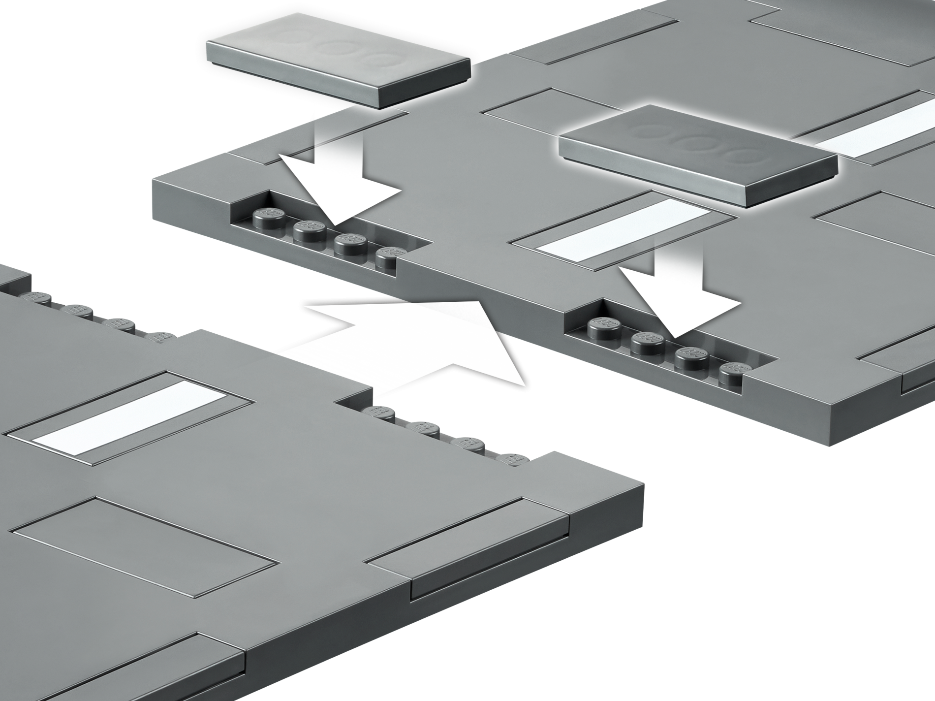 | 1 X Brick, Modified 8 x 16 x 2/3 with 1 x 4 and 2 x 4 Indentations with 6 White Stripes (Crosswalk) Pattern | Dark Bluish Gray |   |  |