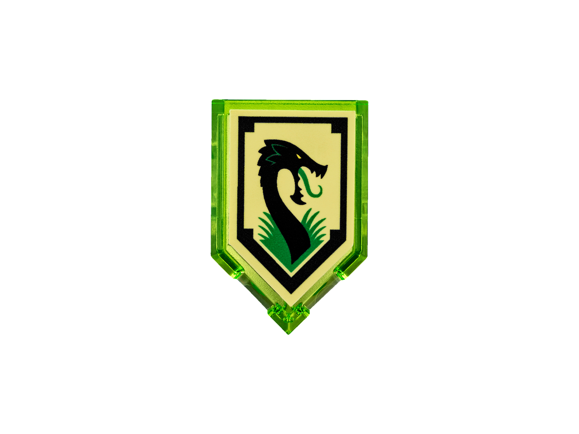 | 1 X Tile, Modified 2 x 3 Pentagonal with Nexo Power Shield Pattern - Jungle Dragon | Trans-Bright Green |   |  |