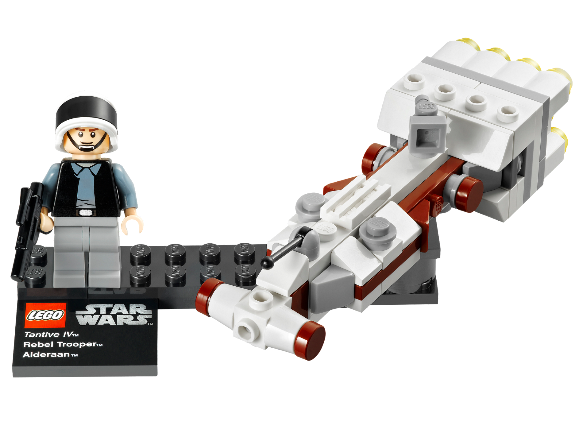 | 1 X Tile, Modified 4 x 4 with Studs on Edge with Lego Star Wars Logo and 'Tantive IV Rebel Trooper Alderaan' Pattern - Set 75011 | Black |   |  |