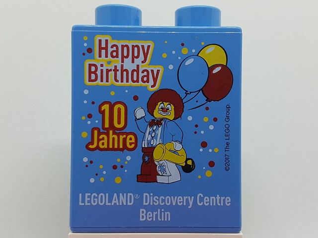 76371pb099 | Duplo, Brick 1 x 2 x 2 with Bottom Tube with Happy Birthday 10 Jahre LEGOLAND Discovery Centre Berlin Pattern |